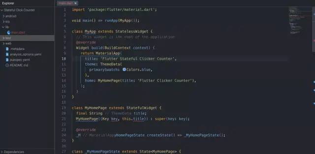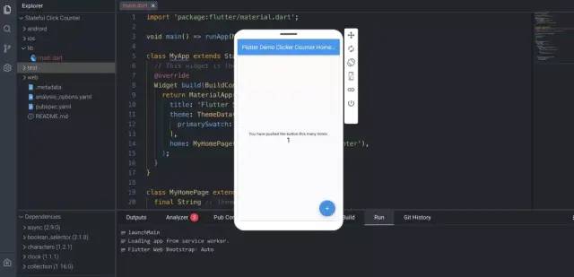 下面的代码是一个简单的Flutter应用程序的例子,它创建了一个点击器计数器。它演示了Flutter应用程序的基本结构,包括使用StatefulWidget和State类来创建一个响应式的用户界面。