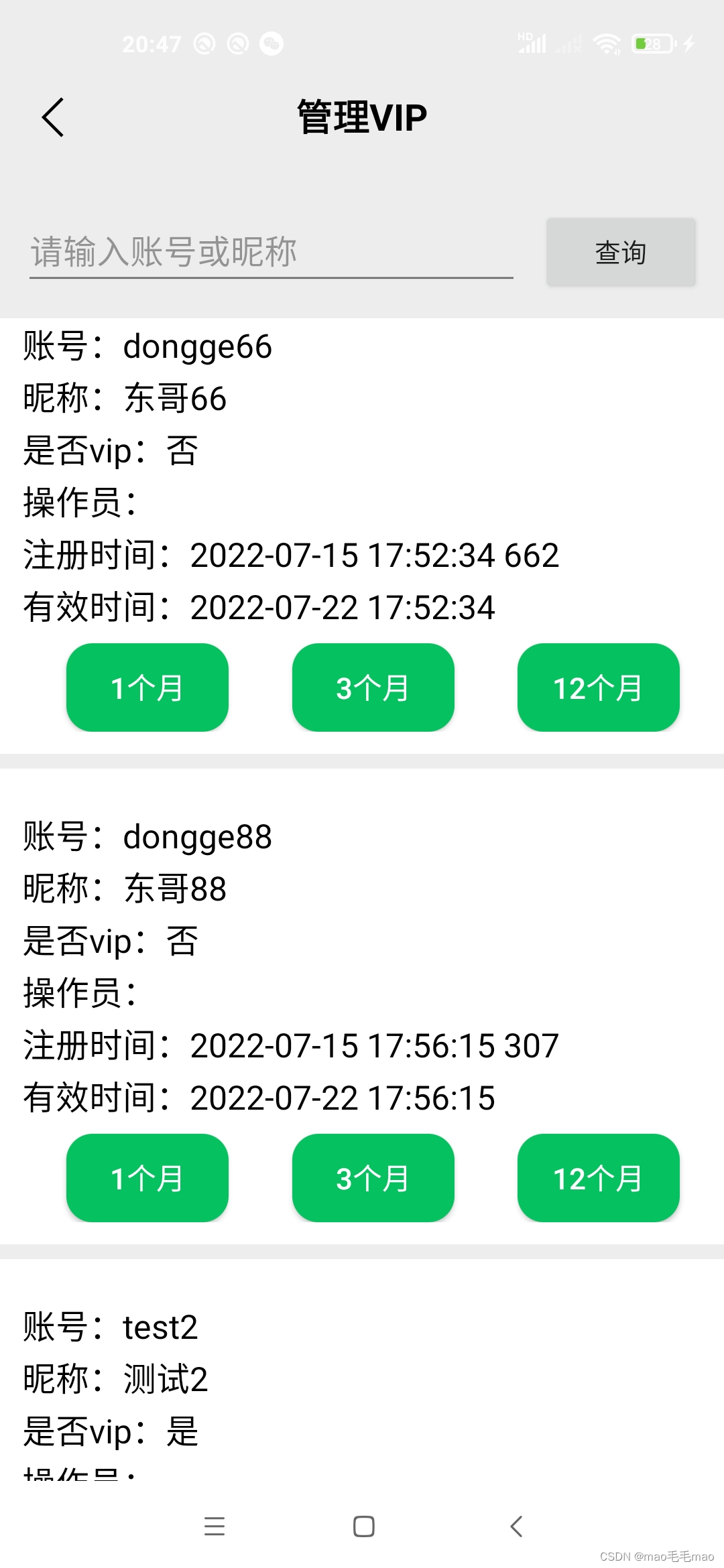 进入vip页面,默认加载列表信息,点击搜索从web服务器模糊查询返回结果。