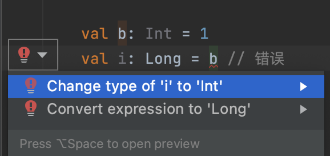 在kotlin中,较小数据类型并不是较大数据类型的子类型,较小的数据类型不能隐式转换为较大的数据类型。 比如在不进行显式转换的情况下,我们不能把 Int 型值赋给一个 Long 变量。