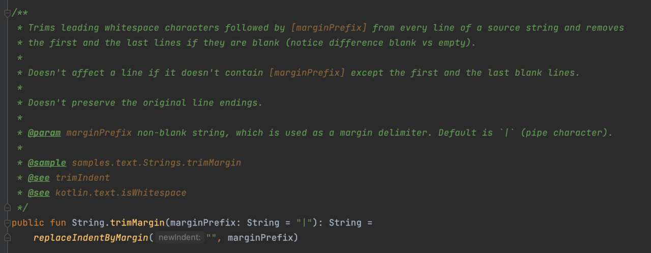 如果你细心点,会发现,我在转行的字符串前都加上了|,这是因为trimMargin()中默认 | 用作边界前缀,但你也可以选择其他字符并作为参数传入,比如 trimMargin(">")。(此方法对应源码如下:)