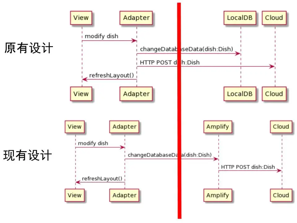 通过上面这个对比图,阅读者可以很清晰的看到,在现有的设计中,我们完全没有修改Adapter和View之间的通信方式和流程顺序,仅仅是修改了Adapter和数据源的操作,从原来的Adapter修改本地数据库和发送网络请求两手一把抓,变成了现在仅需向Amplify SDK修改模型Model数据。