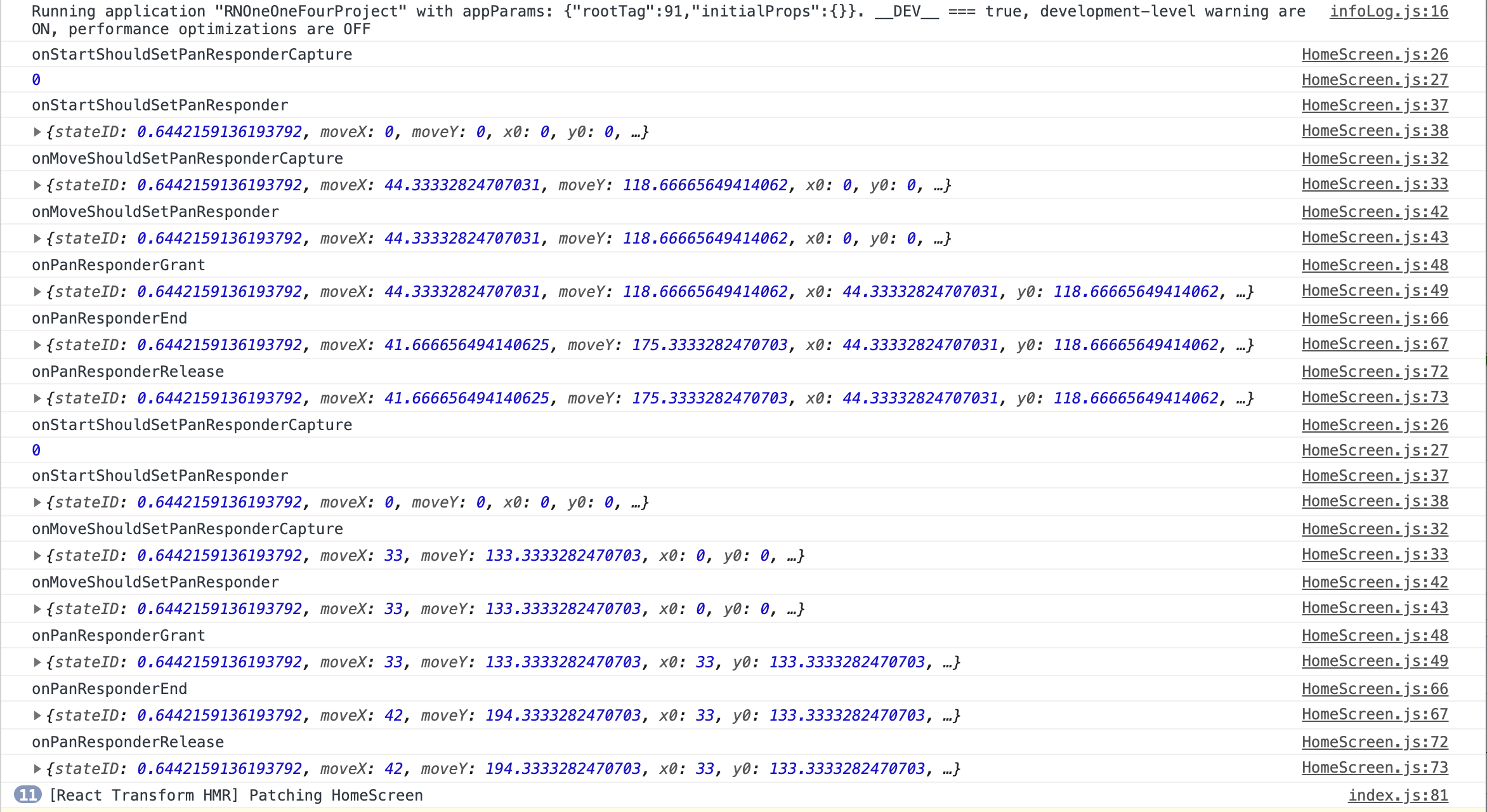 View.props.onResponderMove: (evt) => {} - 用户正在屏幕上移动手指时(没有停下也没有离开屏幕)。