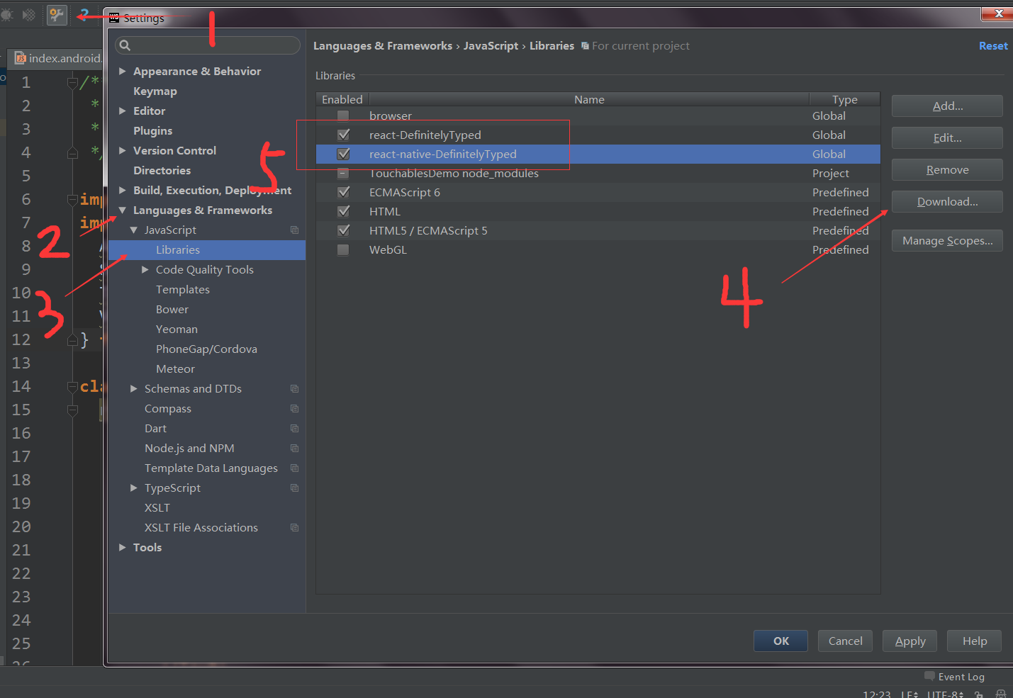 打开 WebStorm,在Preferences -> Language&FrameWorks -> JavaScript -> Libraries 中点击Download ,找到React和ReactNative下载,