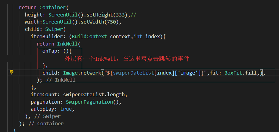 return InkWell( onTap: (){ Application.router.navigateTo(context, '/detail?id=${swiperDateList[index]['goodsId']}'); }, child: Image.network("${swiperDateList[index]['image']}",fit: BoxFit.fill,), );