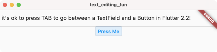 由于现在能够取消按键事件,Flutter 按下空格键和箭头键时不会再触发滚动事件,从而让用户获享更直观的体验。您还可以使用此功能来实现在一个按键事件传播到您应用中的父级 widget 之前对其进行处理。另一个例子是,您可以在您的 Flutter 应用中实现用 Tab 键在 TextField 和按钮之间跳转,一切都可按预期正常运作: