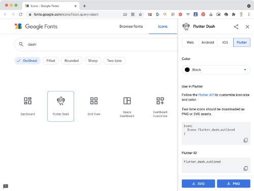 找到理想的图标后,您可以在新的 "Flutter" 标签页中查看有关如何使用该图标的说明。您也可以单独下载这个图标,将其用作应用中的独立资源。在您的 Flutter 应用中加入 Dash 的可爱形象从未如此简单。