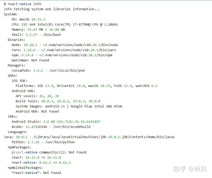 注意!ReactNative需要依赖本地安装对应的 iOS,Android 开发工具,即需要安装 Xcode 和 AndroidStudio。具体安装使用方法这里不赘述。