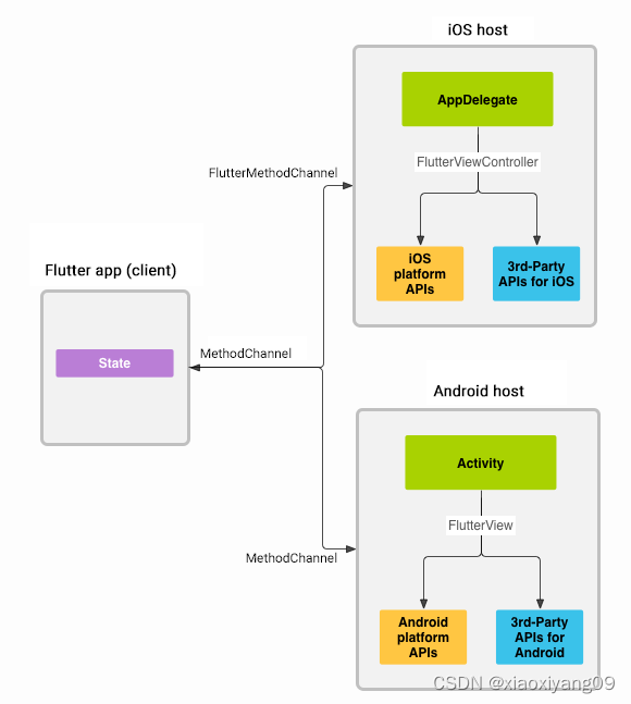 消息使用Channel(平台通道)在客户端(UI)和主机(平台)之间传递,如下图所示: