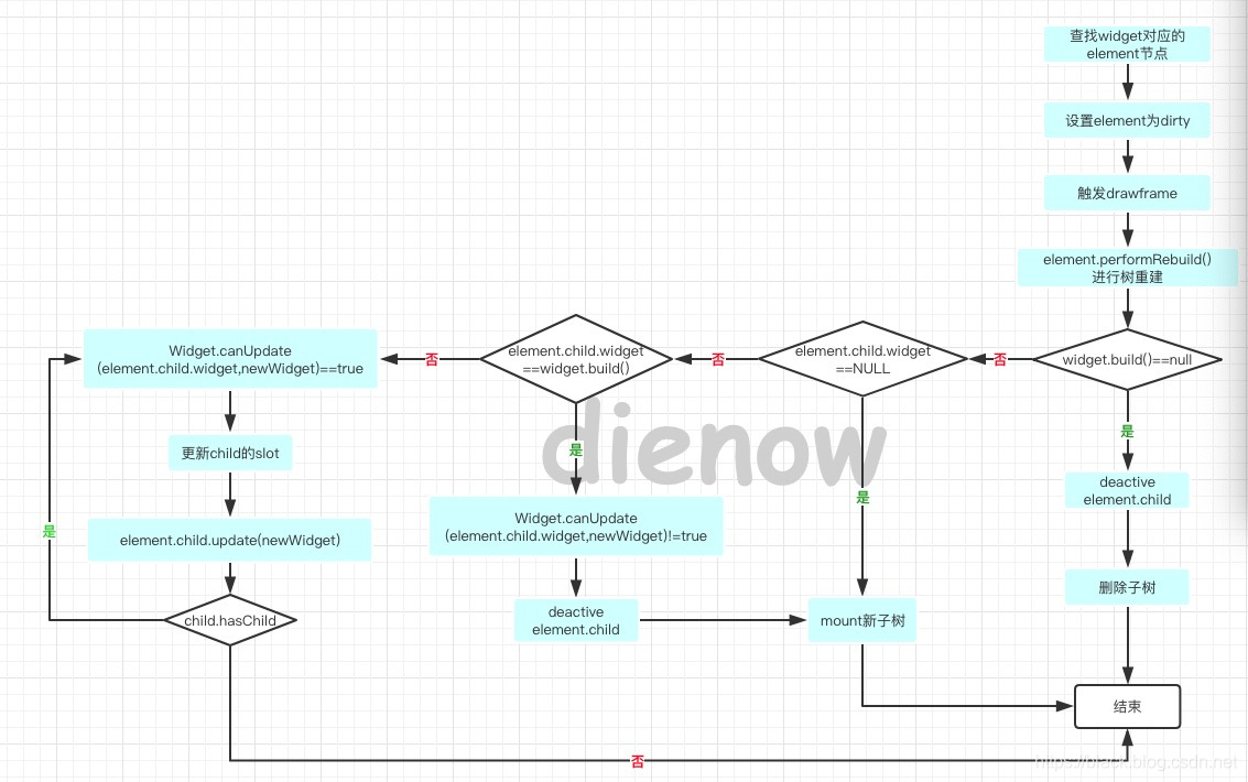 element.child.widget == widget.build() 时,不会触发子树的 update,当触发 update 的时候,如果没有生效,要注意 widget 是否使用就 widget,没有 new widget,导致 update 流程走到改 widget 就停止了