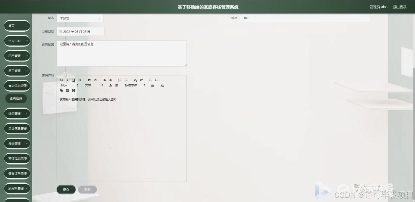 对于游客而言,方便快捷地获取家庭客栈的各种信息,如客房类型、美食信息等,并进行预订等操作,提升了游客的体验感和满意度。从旅游业发展的宏观层面来说,这种管理系统的推广可以提升整个家庭客栈行业的服务质量和竞争力,推动旅游业朝着更加智能化、高效化的方向发展,进一步促进旅游市场的繁荣。精准地对客房信息进行管理,如客房类型、状态等;[14] 刘小玲, 李慧云, 殷珊珊, 贾少华, 许杰辉, 郝颖. 一种基于