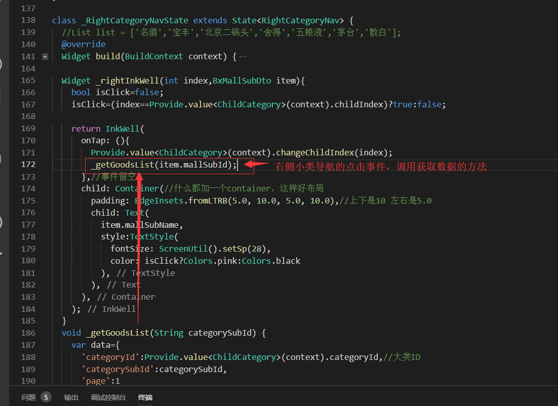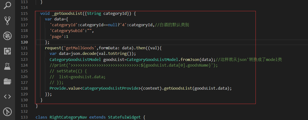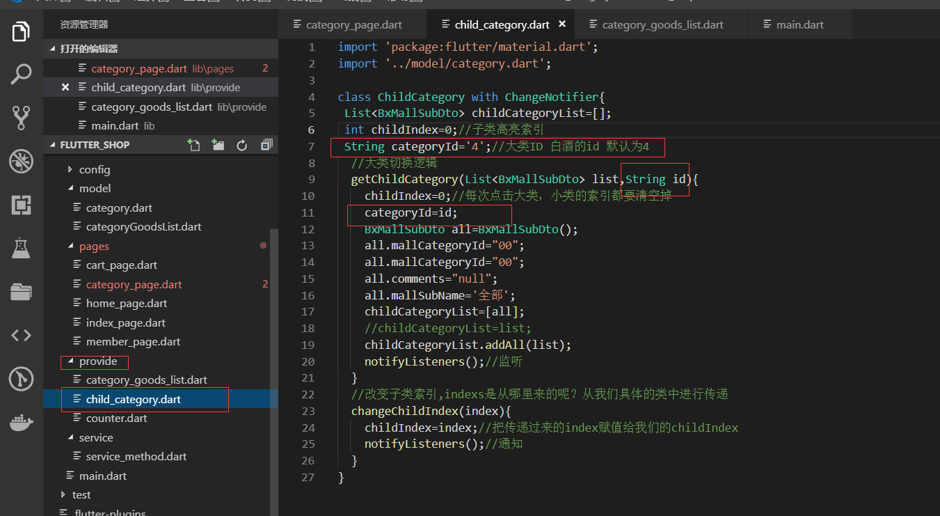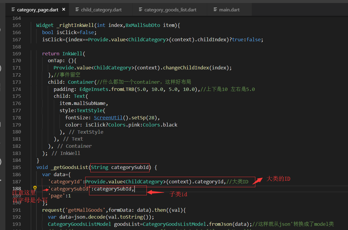 获取右侧下面的列表信息,即要传递大类的id也要传递小类的,所以需要把左侧的大类的id也要Provide化