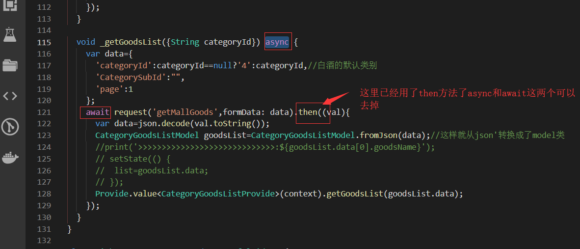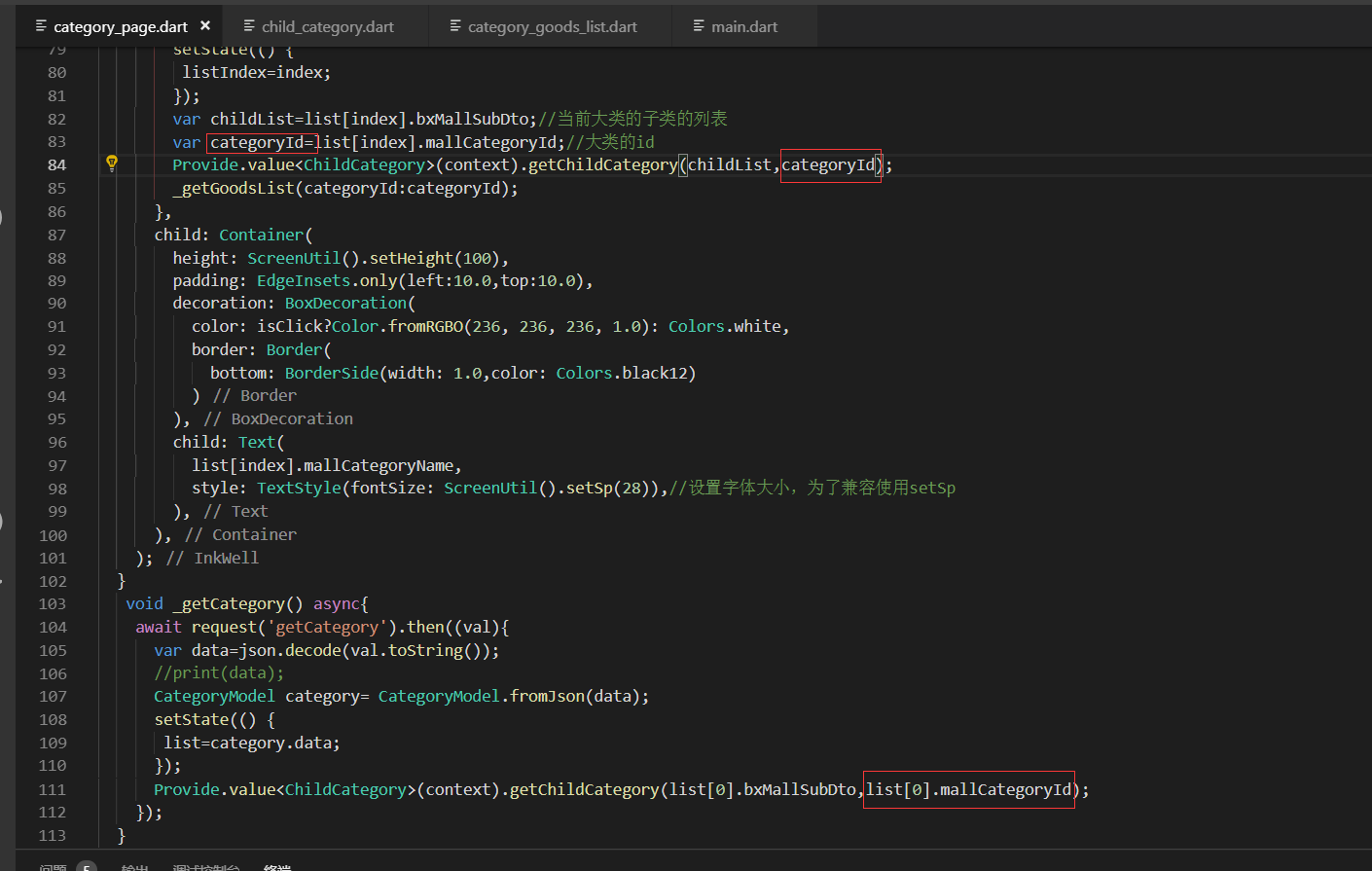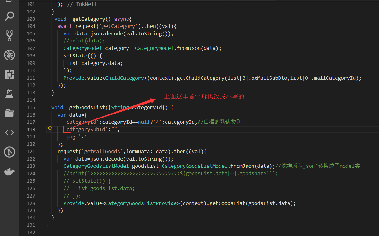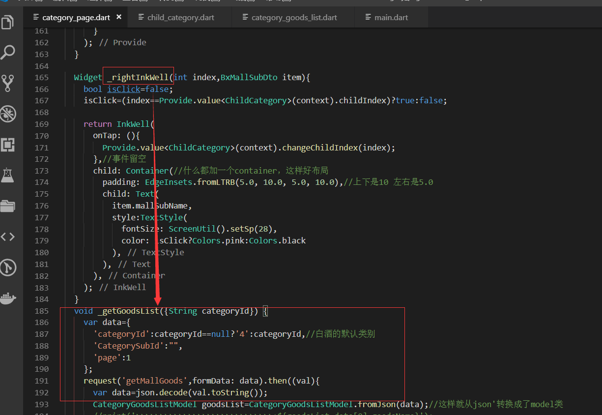 获取右侧下面的列表信息,即要传递大类的id也要传递小类的,所以需要把左侧的大类的id也要Provide化