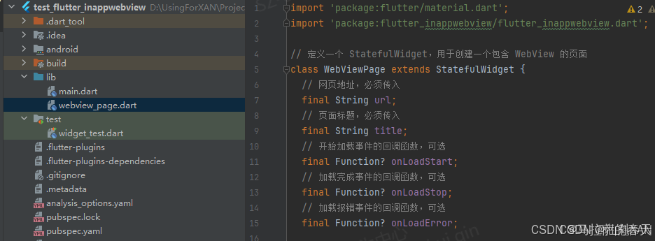 它包含一个 late InAppWebViewController _webViewController,用于控制 InAppWebView。