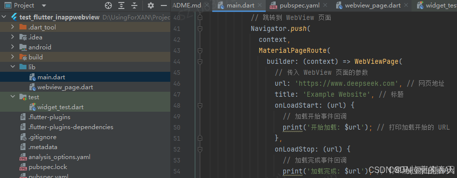 在 WebViewPage 的 State 类中,使用 InAppWebView 加载网页,并处理加载事件。