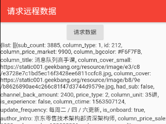 import 'package:flutter/material.dart'; import 'package:dio/dio.dart'; class HomePage extends StatefulWidget { _HomePageState createState() => _HomePageState(); } class _HomePageState extends State<HomePage> { String showText='还没有请求数据'; @override Widget build(BuildContext context) { return Container( child: Scaffold( appBar: AppBar(title: Text('请求远程数据'),), body: SingleChildScrollView( child: Column( children: <Widget>[ RaisedButton( onPressed: _jike, child: Text('请求数据'), ), Text(showText) ], ), ), ), ); } void _jike(){ print('开始向极客时间请求数据............'); getHttp().then((val){ setState(() { showText=val['data'].toString(); }); }); } Future getHttp()async{ try{ Response response; Dio dio = new Dio(); response =await dio.get("https://time.geekbang.org/serv/v1/column/topList"); print(response); return response.data; }catch(e){ return print(e); } } }