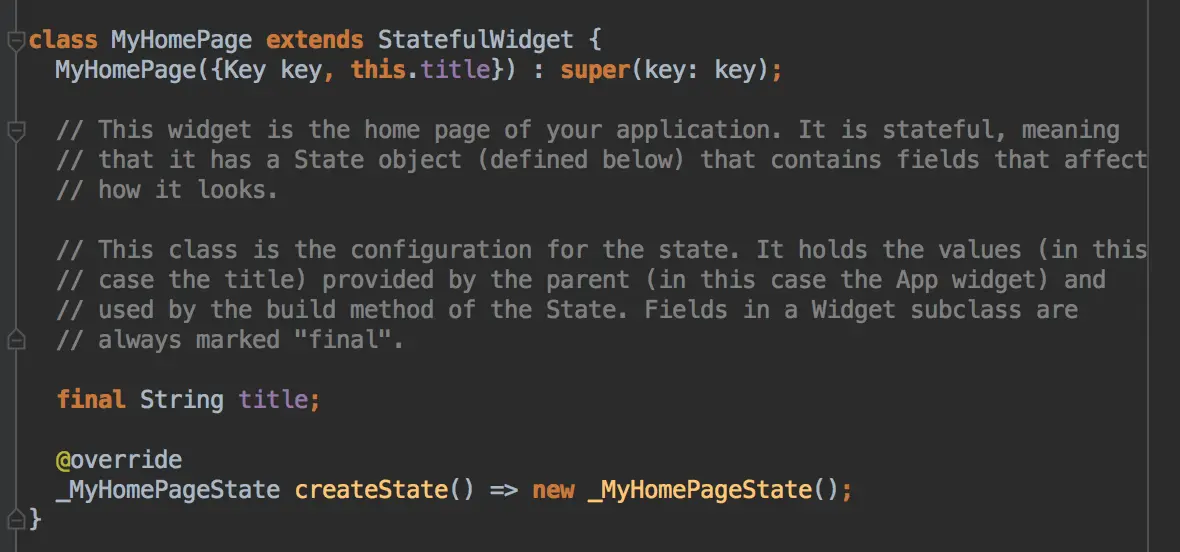 最后就是最重要的创建界面元素方法了,它是之前MyHomePage对象的具体实现,属于Widget,因此也是在build方法中构建的。