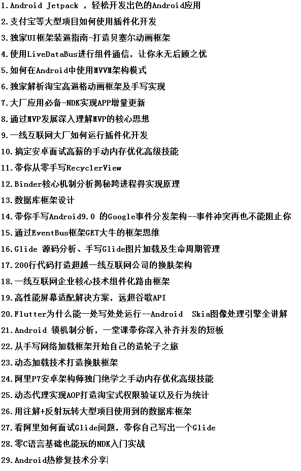 这份资料我从春招开始,就会将各博客、论坛。网站上等优质的Android开发中高级面试题收集起来,然后全网寻找最优的解答方案。每一道面试题都是百分百的大厂面经真题+最优解答。包知识脉络 + 诸多细节。