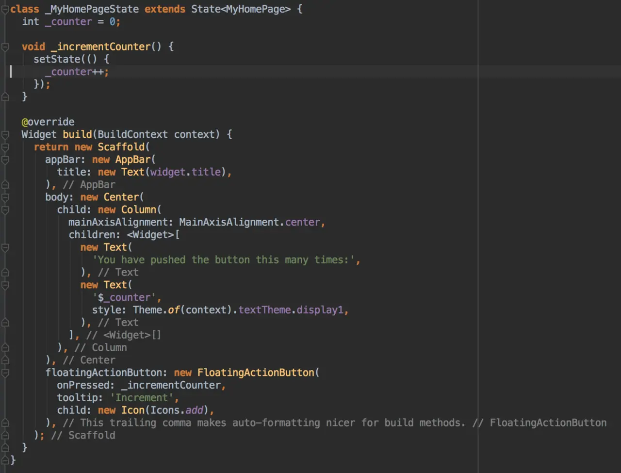 Scaffold里面自带了一个AppBar,里面的body就是内容了,它创建了一个垂直居中显示的容器,里面放了两个TextWidget,最后定义了一个floatingActionButton。就是之前UI中的那个加号按钮。当点击按钮的时候会调用_incermentCounter()方法,这里的setState()方法会调用UI重绘刷新。