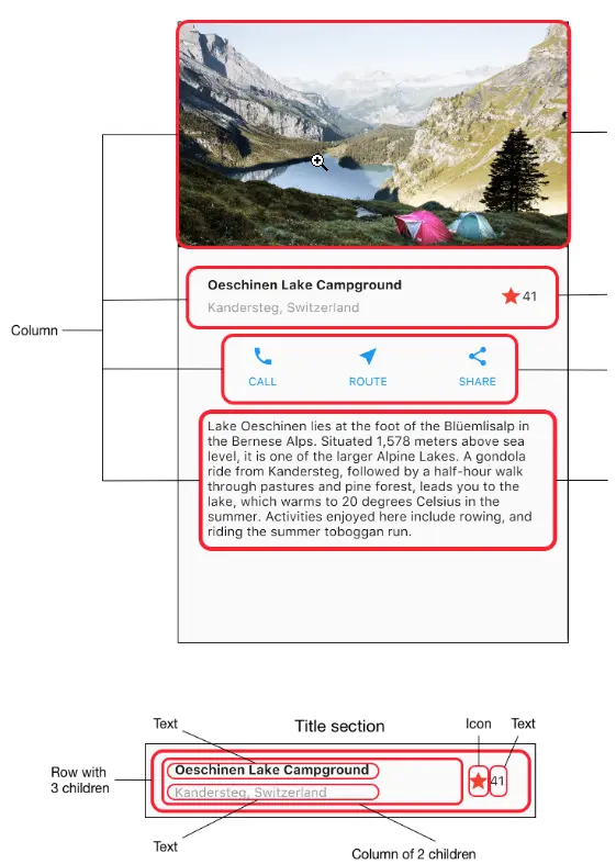 接下来,图解每行。第一行,我们称其Title Section,有3个子组件:一列文本区域,一个星型图标,及一个数字。第一列子组件包含2行文本。且第一列占有较大空间,因此需要将两行文本放在Expanded组件中。