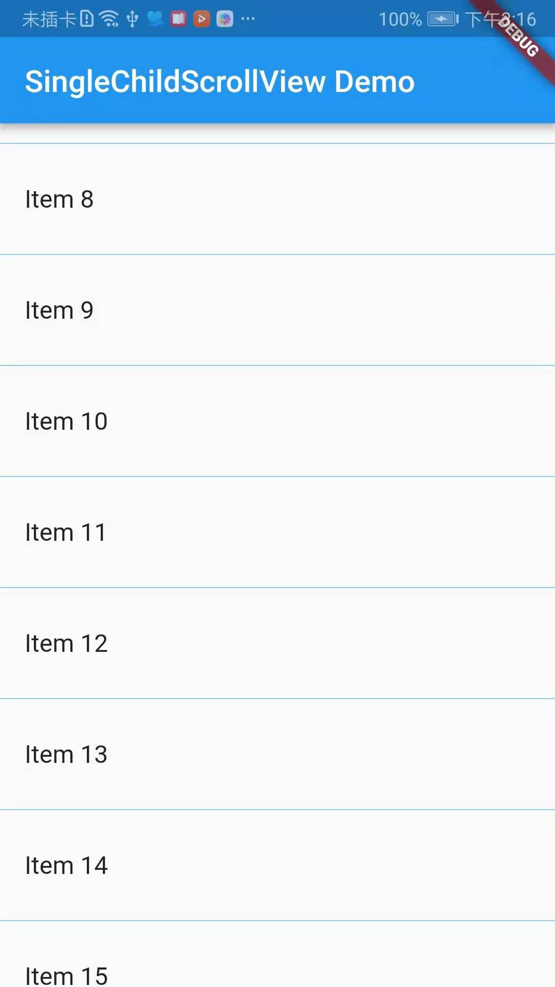 import 'package:flutter/material.dart'; void main() => runApp(DemoApp()); class DemoApp extends StatelessWidget { //初始化数据源 final List<String> items = new List<String>.generate(200, (i)=>"Item $i"); @override Widget build(BuildContext context) { return new MaterialApp( title: 'SingleChildScrollView Demo', home: new Scaffold( appBar: AppBar( title: new Text('SingleChildScrollView Demo'), ), body:new ListView.separated( //列表滑动到边界时,显示iOS的弹出效果 physics: BouncingScrollPhysics(), itemCount: items.length, //列表项构造器 itemBuilder: (context,index){ return ListTile(title: new Text('${items[index]}'),); }, //分割构造器 separatorBuilder: (context,index){ //分割组件 return new Divider(color: Colors.blue,); }, ), ), ); } }