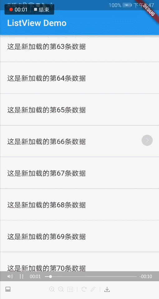 先缕一下实现的思路,我们想要实现的效果是每页20条内容,共5页的内容,1-4页末尾数据后要展示加载新数据的loading,到第5页末尾数据展示“我是有底线的”,因此,我们的itemCount就要是itemCount: _items.length + 1.而不是itemCount: _items.length + 1,这是因为要在最后留出来loading的位置,接下来就是要处理构建LisvtView里面的每一条item,如果当前item的索引是列表数据的最后一条数据,并且不是最后一页的话,展示loading,如果当前item的索引是列表数据的最后一条数据,并且是最后一页的话,展示“我是有底线的”,如果当前item的索引不是列表数据的最后一条,则展示下一条数据的内容。最后要处理的就是当页面滑动到最后了,要怎么获取新的数据。前面我们在写页面滑动的部分有讲到过controller属性(此属性接收一个ScrollController对象,ScrollController的主要作用是控制滚动位置和监听滚动事件),我们现在需要做的就是通过ListView的controller控制器来判断页面是否滑动到了最底部,如果滑动到了最底部,则获取新的数据并插入到list里面,最后通过setState通知页面重新构建。