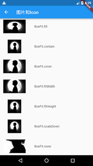 2、fit:该属性用于在图片的显示空间和图片本身大小不同时指定图片的适应模式,有点类似于Android 中ImageView的scaleType属性。适应模式是在BoxFit中定义,它是一个枚举类型,有如下值: