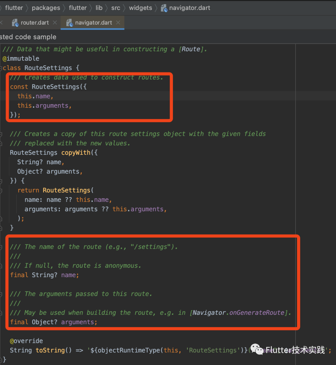 而打开 RouteSettings 类的实现看到其构造函数有 name 和 arguments,其中 name 为路由名称,arguments 就是传递的参数,其类型为 Object。