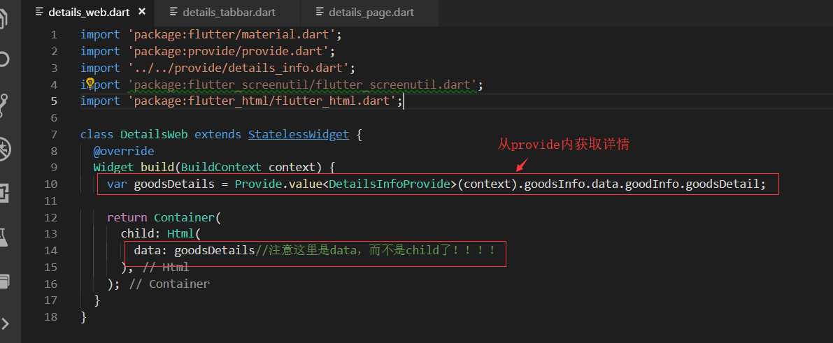 import 'package:flutter/material.dart'; import 'package:provide/provide.dart'; import '../../provide/details_info.dart'; import 'package:flutter_screenutil/flutter_screenutil.dart'; import 'package:flutter_html/flutter_html.dart'; class DetailsWeb extends StatelessWidget { @override Widget build(BuildContext context) { var goodsDetails = Provide.value<DetailsInfoProvide>(context).goodsInfo.data.goodInfo.goodsDetail; return Container( child: Html( data: goodsDetails//注意这里是data,而不是child了!!!! ), ); } }
