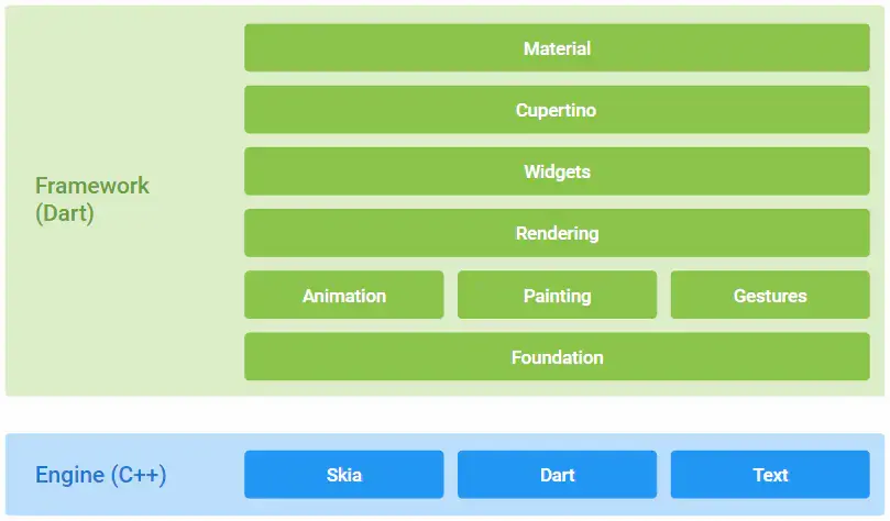 Flutter 中绝大部分的 Widget 都与平台无关, 开发者基于 Framework 开发 App ,而 Framework 运行在 Engine 之上,由 Engine 进行适配和跨平台支持。这个跨平台的支持过程,其实就是将 Flutter UI 中的 Widget “数据化” ,然后通过 Engine 上的 Skia 直接绘制到屏幕上 。