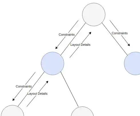 第一个线性过程用于传递布局约束。父节点给每个子节点传递约束,这些约束是每个子节点在布局阶段必须要遵守的规则。就好像父母告诉自己的孩子 :“你必须遵守学校的规定,才可以做其他的事”。常见的约束包括规定子节点最大最小宽度或者子节点最大最小的高度。这种约束会向下延伸,子组件也会产生约束传递给自己的孩子,一直到叶子结点。