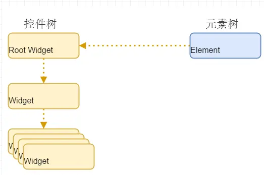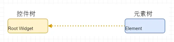 每次,当控件挂载到控件树上时,Flutter 调用其 createElement() 方法,创建其对应的 Element。Flutter 再将这个 Element 放到元素树上,并持有创建它控件的引用,如下图: