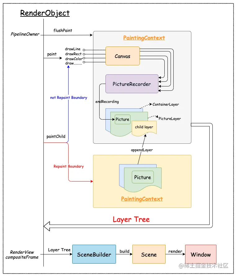 对于 Paint 操作来说,父节点需要用到子节点绘制的结果,故子节点需要先于父节点被绘制。 因此,不同于前两个 flush 操作,此时需要对『 Needing Paint RenderObjects 』按深度降序排序。 如下图,在深入浅出 Flutter Framework 之 PaintingContext一文中详细分析了从PipelineOwner#flushPaint到PaintingContext内部操作的过程,在此不再赘述。