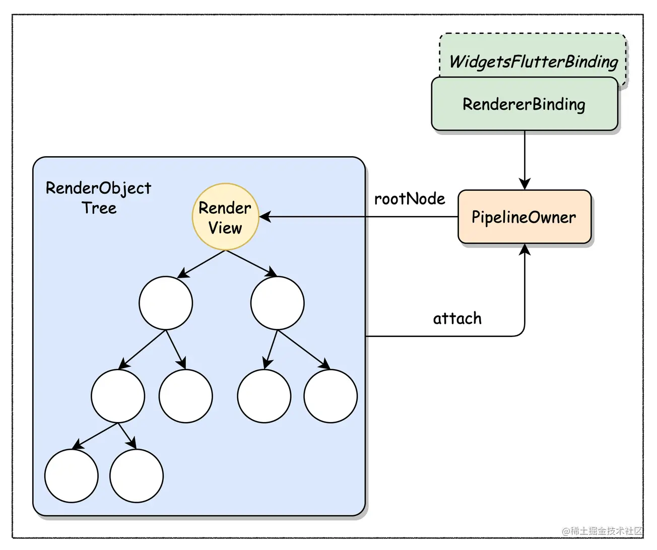 RendererBinding会创建『RenderObject Tree』的根节点,即:RenderView,并将其赋值给PipelineOwner#rootNode,Code1-第13~24行 - 在『RenderObject Tree』构建过程中,每插入一个新节点,就会将