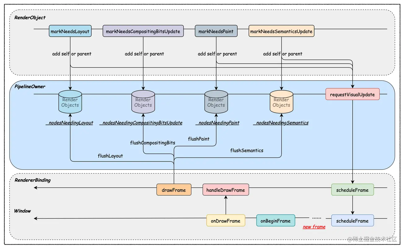 上述就是 PipelineOwner 不断收集『 Dirty RenderObjects 』的过程。