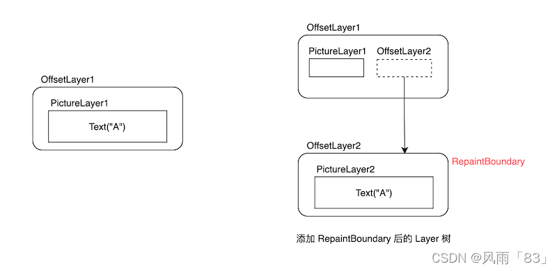我们来分析一下原因:根据上一节的知识,我们可以很容易画出添加 RepaintBoundary 前和后的 Layer 树结构,如图14-19: