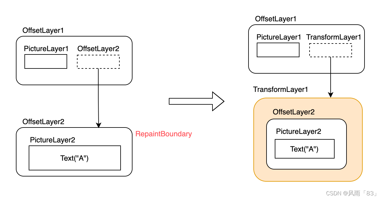 很显然,CustomRotatedBox 中进行旋转变换的 canvas 对应的是 PictureLayer1,而 Text("A") 的绘制是使用的PictureLayer2 对应的 canvas ,他们属于不同的 Layer。可以发现父子的 PictureLayer "分离了",所以CustomRotatedBox 也就不会对 Text("A") 起作用。那么如何解决这个问题的思路呢?