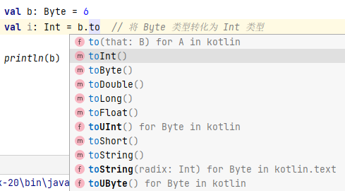 val i: Int = b.toInt() // 将 Byte 类型转化为 Int 类型