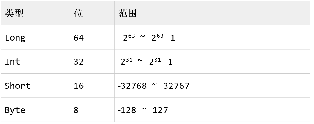 在 Kotlin 中,整数类型的标准大小与其他语言相同: