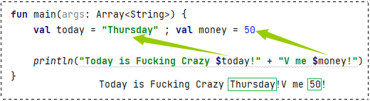 println("Today is Fucking Crazy $today !" + "V me $money!")