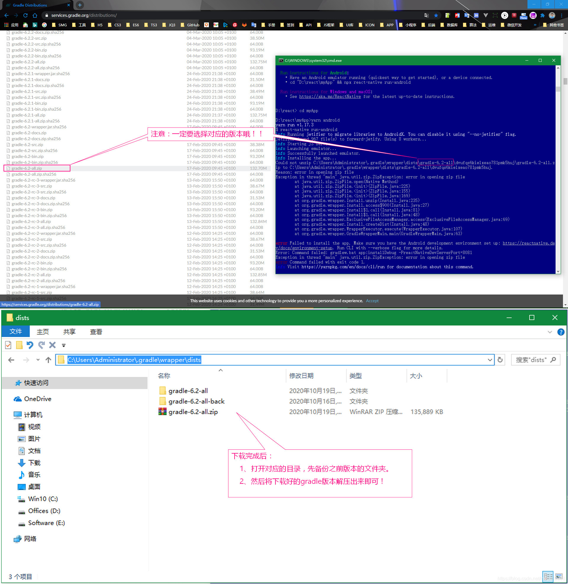 2、在启动运行(yarn android)时,报Could not unzip “路径...\gradle.6.2.all.zip”问题