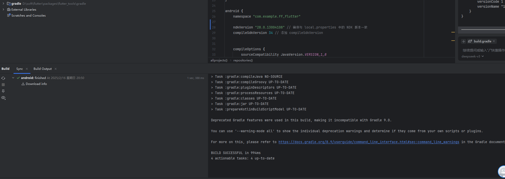 果然 在app 里面的gradle 配置不对, ndkVersion “28.0.13004108” // 确保与 local.properties 中的 NDK 版本一致 这个版本此前不对应,因此改了下如下。据错误信息,flutter build 任务执行失败,通常是由于 Flutter 项目本身的问题或环境配置不正确导致的。如果你的项目中没有配置测试模块(例如 src/test 目录),Gra