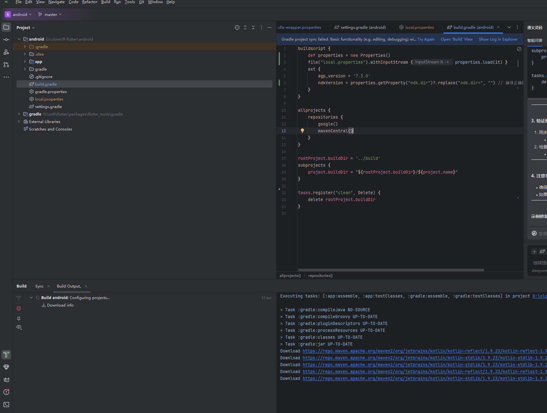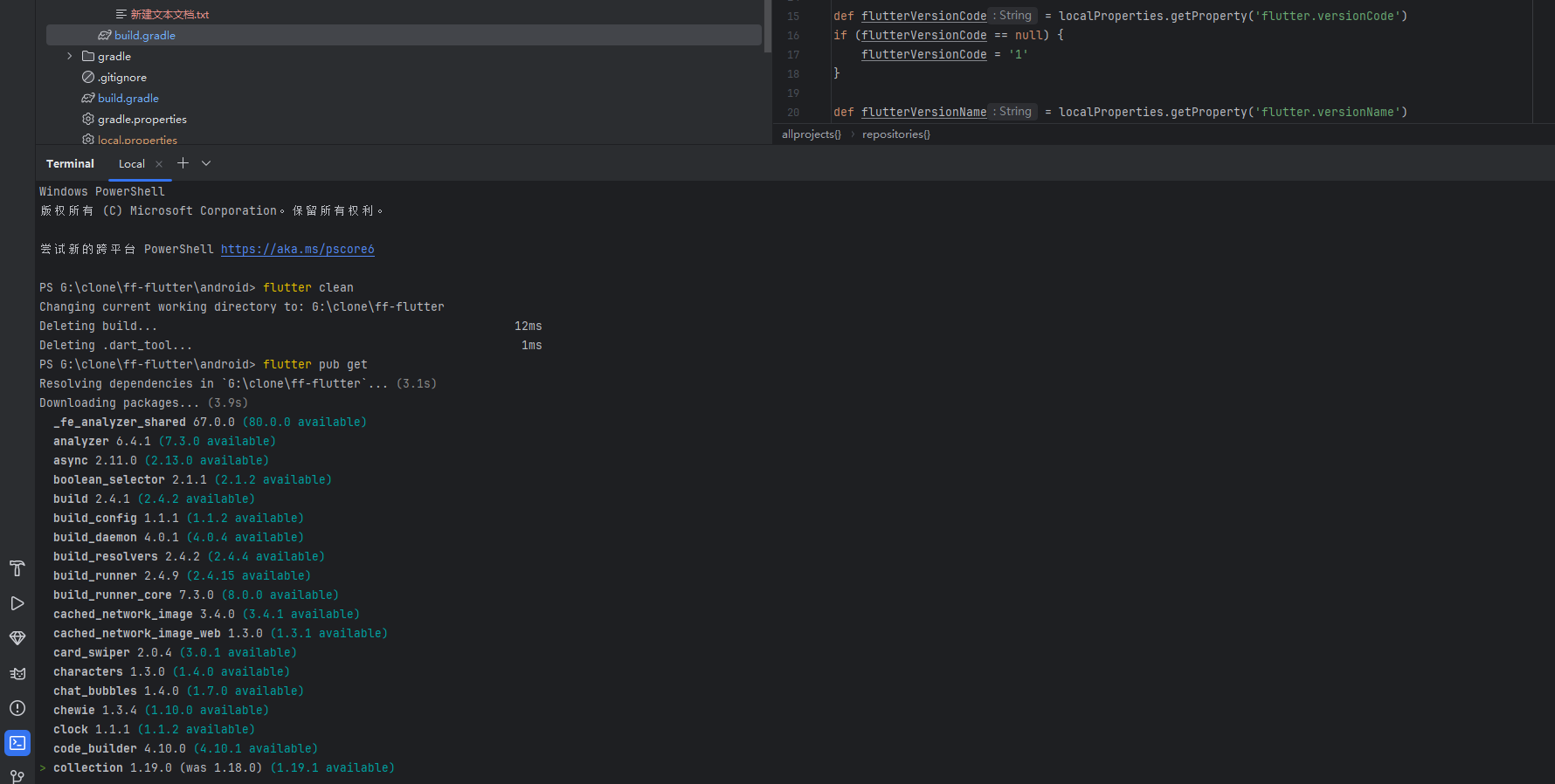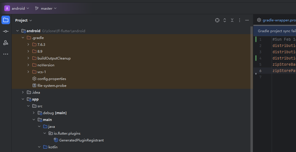 打开 settings.gradle 文件(位于 G:\clone\ff-flutter\android\settings.gradle)。