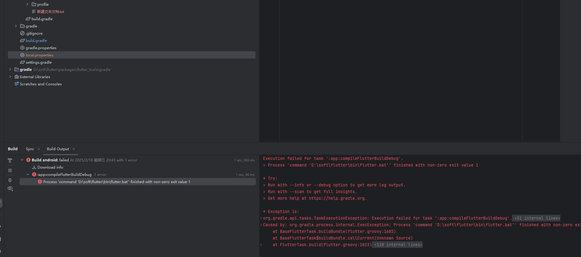 据错误信息,flutter build 任务执行失败,通常是由于 Flutter 项目本身的问题或环境配置不正确导致的。