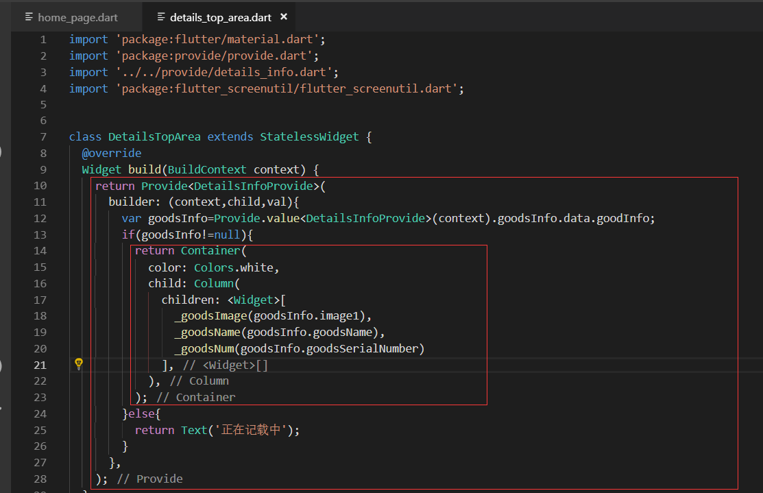 import 'package:flutter/material.dart'; import 'package:provide/provide.dart'; import '../provide/details_info.dart'; import './details_page/details_top_area.dart'; class DetailsPage extends StatelessWidget { final String goodsId; DetailsPage(this.goodsId);//flutter 1.2的最新的写法 构造函数 @override Widget build(BuildContext context) { return Scaffold( appBar: AppBar( leading: IconButton( icon: Icon(Icons.arrow_back), onPressed: (){ Navigator.pop(context);//返回上一个页面 }, ), title: Text('商品详细页'), ), body: FutureBuilder( future: _getBackInfo(context), builder: (context,snapshot){ //判断是否有数据 if(snapshot.hasData){ //如果有数据返回一个Container return Container( child: Column( children: <Widget>[ DetailsTopArea(), ], ), ); }else{ return Text('加载中......');//没有数据的情况 } }, ), ); } Future _getBackInfo(BuildContext context) async{ await Provide.value<DetailsInfoProvide>(context).getGoodsInfo(goodsId); //print('加载完成...........'); return '完成加载'; } }