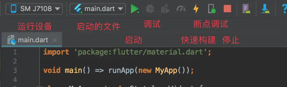 和其他语言一样,dart通过main()函数开始执行所有的逻辑,这里main函数创建了一个叫MyApp的对象,他是一个Widget,在Flutter世界里,所有的界面元素都是Widget,类似于Android中的View。
