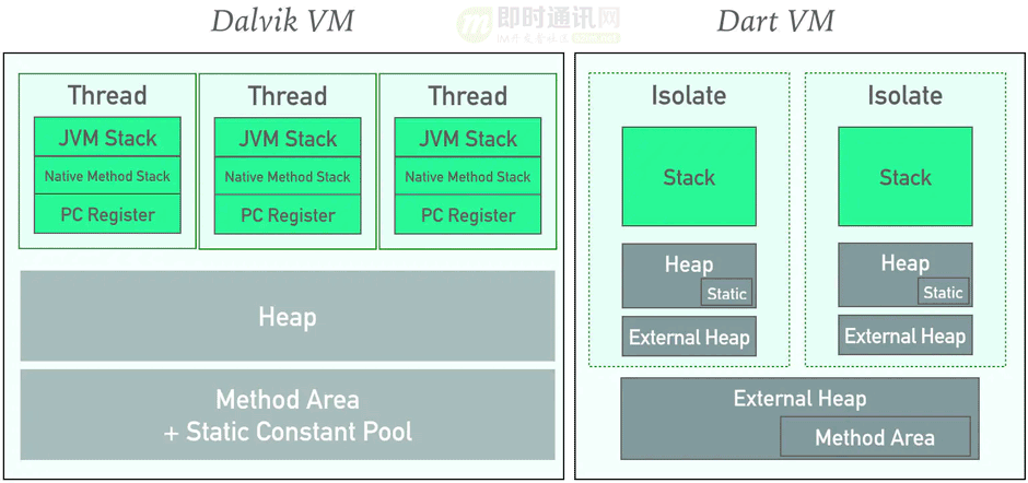 此外有两个独立于上述体系之外的架构就是Flutter和KMM(谷歌基于Kotlin实现类似Flutter架构),其中Flutter运行特定DartVM,将内存数据挂载其自身的isolate中。