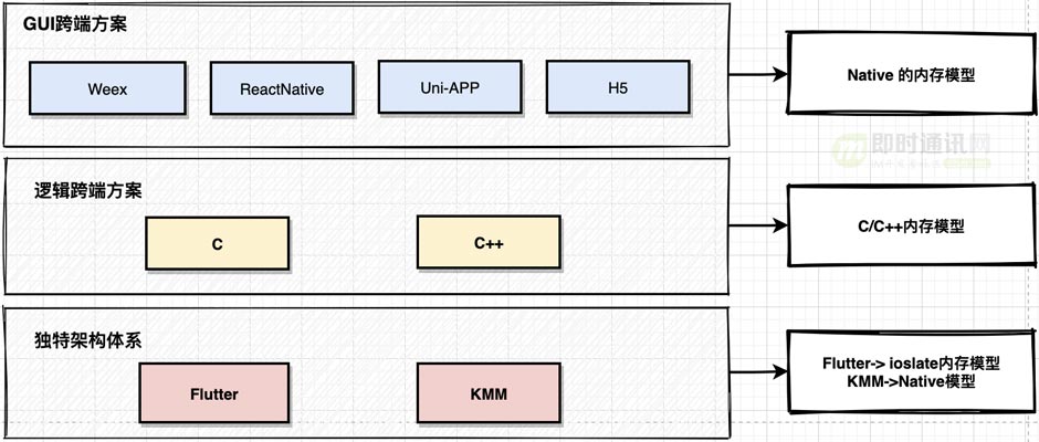 在GUI层面的跨端方案有Weex、ReactNative、H5、Uni-APP等,其内存模型大多需要通过桥接到Native模式存储。