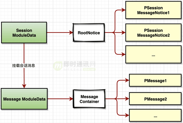 - 1)会话内存数据模型交托于SessionModuleData:会话内存数据有一个根节点RootNotice,然后其挂载PSessionMessageNotice(这里PSessionMessageNotice是ORM映射的会话DB表模型)子节点集合。