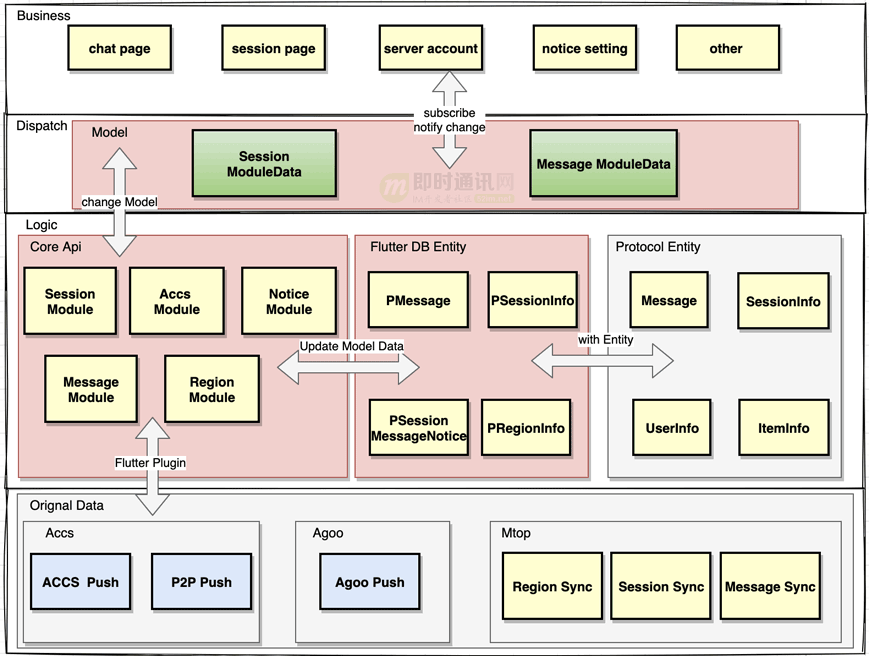 Flutter IM重点集中改造逻辑层和分发层,将IM核心逻辑和业务层面数据模型进行封装隔离,核心逻辑层和数据库交互后将数据封装到分发层的moduleData中,通过订阅方式分发到业务层数据模型中。