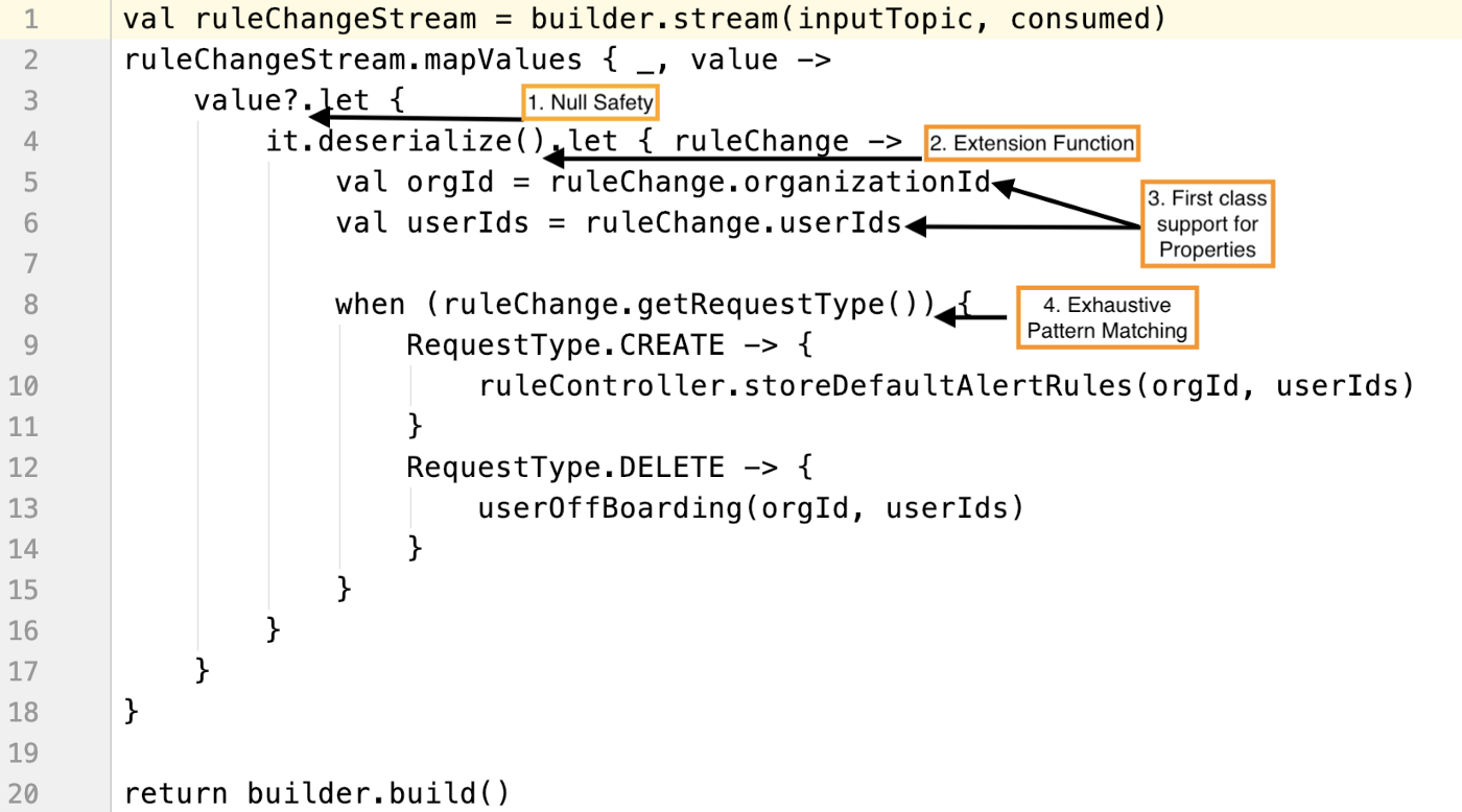 Kotlin 简洁易懂的代码的一个很好的例子是我们的规则更改处理器 Kafka 流作业,它对输入数据进行空安全验证,使用扩展函数反序列化数据,然后使用详尽的模式匹配对数据执行操作。